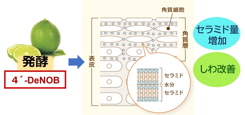 シトラス果皮発酵エキスに含まれる「4'-DeNOB」は、セラミド合成促進による肌質改善とシワ改善効果が確認されました。今後も引き続きシミ、シワ、乾燥をはじめとした肌質の悩みとエイジングサインに対して、さらなる効果の実証に尽力してまいります。