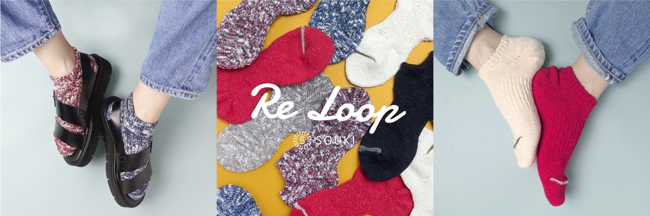 創喜では「扱える職人がごく僅か」ともいわれる珍しい国産のヴィンテージ靴下編機を、大切に修理しながら使い続けています。中でも編み目が大きくふっくらとしたローゲージの靴下づくりには定評があり、環境に配慮しながらも品質の良い素材をたっぷりと使う「Re Loop」は定番人気のオリジナルブランドです。