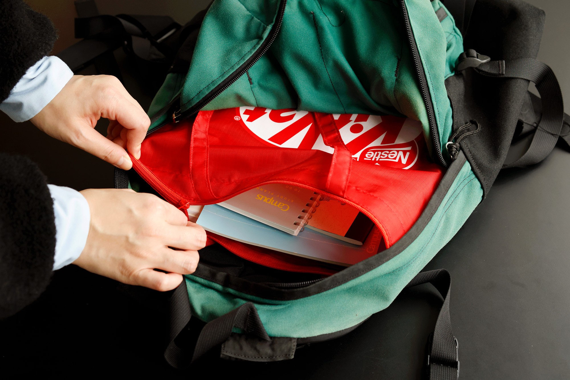 トートバッグは、A4サイズのノートや書類だけでなく、大きめの本や参考書も余裕で入るサイズ。内側の仕切りつきポケットには、スマホや財布、鉛筆やマーカーペンなどを分けてしまえます。しなやかな素材でファスナーつきなので、メインのリュックやバッグに入れて、バッグインバッグとして使うのもおすすめ。メインのリュックを替えたいときも、このバッグごと入れ替えられてラクチンです。また、ちょっとした買い物にも重宝。縦が37cmあるので、セロリやバゲットのような長い食材も入り、8cmのまちつきで、根菜などのごろっとした食材もおまかせです。パスケースに交通系ICカードなどを入れておけばタッチ決済もスムーズ。勉強・仕事・買い物のお供に、毎日大活躍してくれます。