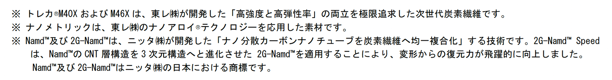 ヨネックスが長年培ってきたカーボン加工技術により、多様な高機能素材を最適な部分に配置。空力性能に重要な箇所には高剛性素材「トレカ®M40X/M46X」や「NANOMETRIC DR」を、しなり性能には「2G-Namd™ Speed」を採用し、空力・剛性・軽量化を高次元で調和させています。
