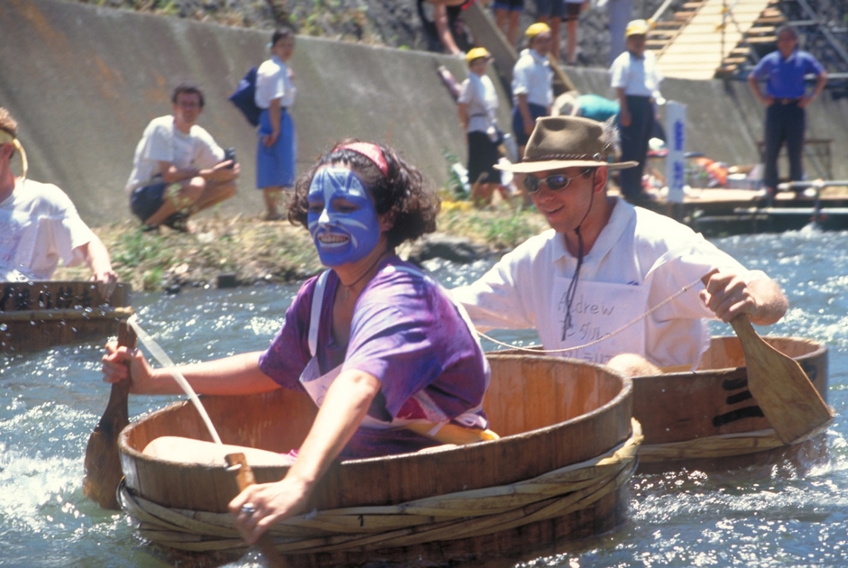 松川タライ乗り競走は、1956年から続いている、温泉街の中心に流れる松川で行われる夏のイベントの一つです。直径1メートルほどの大きなたらいに乗り、しゃもじのような小さな櫂を漕いで速さを競うユニークな競技です。