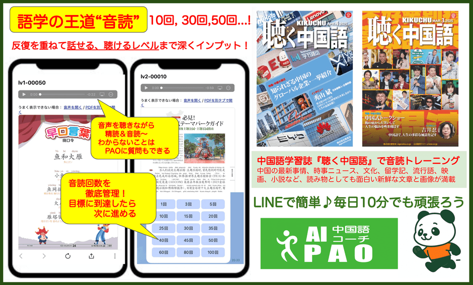 LINEで続くAI中国語学習! 『聴く中国語』教材×AI中国語コーチPAO 「ジョギングプラン」で、音読+会話を習慣化