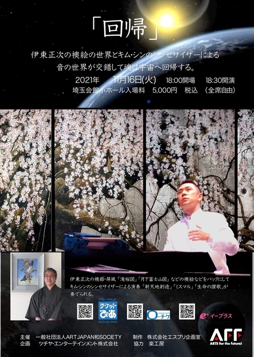 一般社団法人 ARTJAPAN和SOCIETY(所在地:東京都稲城市、理事:長尾まこ)は、コロナ禍の中感染対策を万全に行い、伊東正次の日本画屏風絵と今回のイベントの為に特別に制作した映像と共にキム・シンのシンセサイザー演奏を聴くリアルタイムイベントを埼玉県さいたま市にある埼玉会館で開催いたします。
