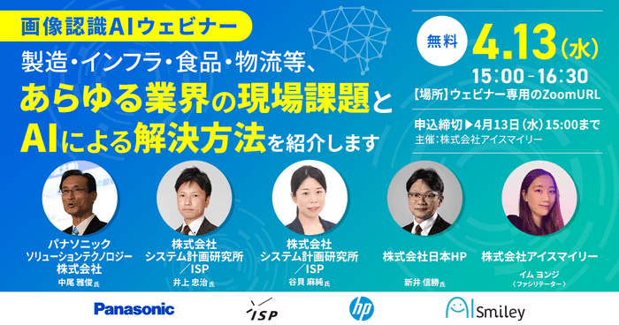 人工知能を搭載したサービスの資料請求ができるAIポータルメディア「AIsmiley」を運営するアイスマイリー(東京都渋谷区、代表取締役:板羽晃司)は、2022年4月13日(水)15時から「現場の課題解決に特化した画像認識AI」をテーマにウェビナーを開催します。