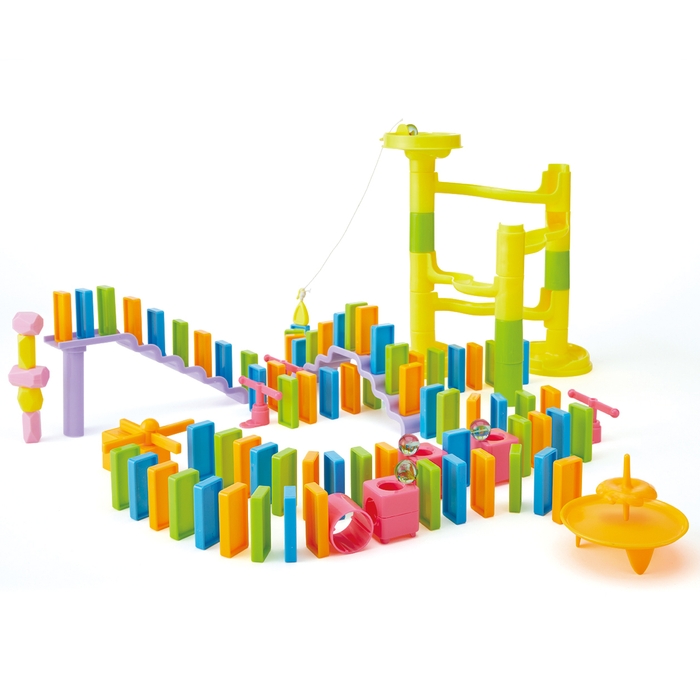 ドミノ牌と様々な動きのギミックを組み合わせてドミノ倒し遊びが楽しめます。入っているギミックは、ドミノ倒しの定番であるスピナー、階段の他に、ビー玉を転がしてドミノにぶつけて遊ぶスロープ、回転の力でドミノを倒すスタートコマ、ドミノの倒れる力で崩す積み木、トンネルが入っているので、ドミノ遊びの幅が広がります。