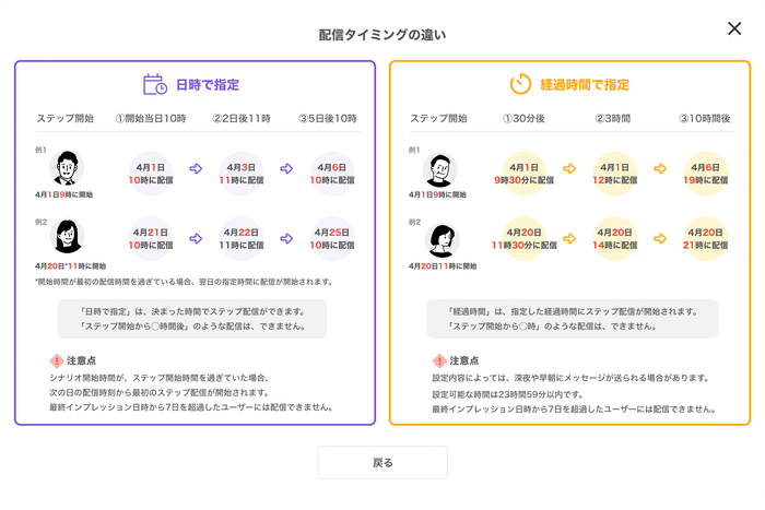 ステップ開始時から「〇日後の〇時〇分」にメッセージを送信