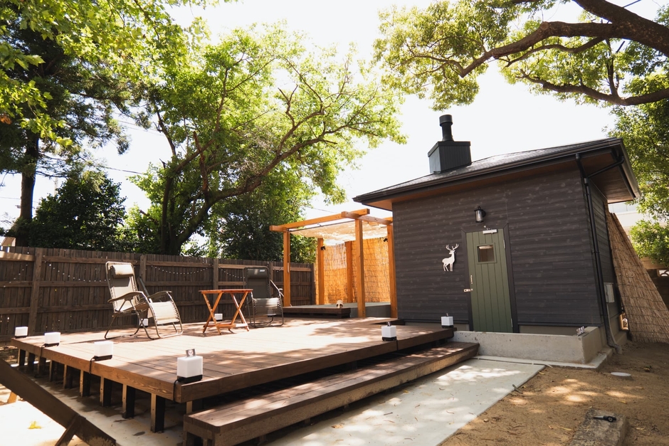 敷地内には趣のある古民家と市街地とは思えない自然の木々に囲まれたプライベート空間があります。外気浴スペースとして静かな空間で自然と一体化しながら整える特別空間をご用意しております。