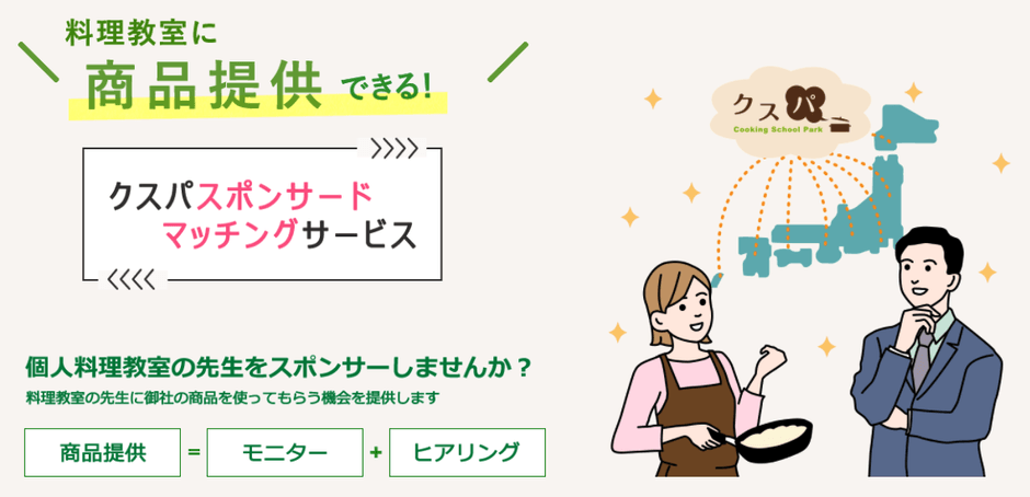 そこで、今回、食材や調理器具を提供することで料理教室をスポンサードしたい企業と、新しい商品に興味があり支援を受けたい先生をマッチングするサービスを開始することにしました。