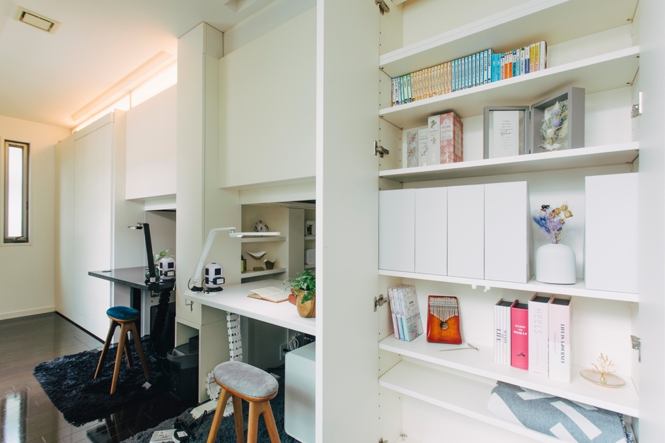 「間仕込」をリビングに置き、新たに籠れるスペースをつくりました。仕事や趣味など、使い方は人それぞれ。家族やペットの目を気にせずに没頭することができます。テレワークでのオンライン会議にも快適な空間をつくれます。