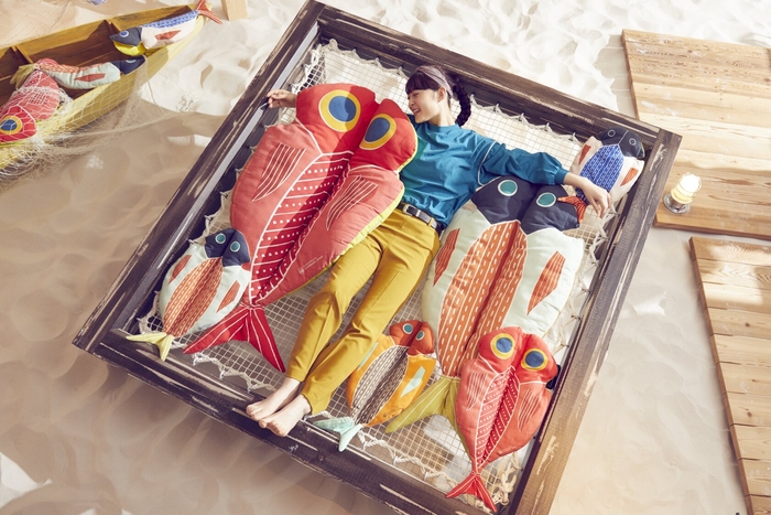ソラノビーチ Books&Cafeを、クッションやサーフボード、ガーランドなど干物をモチーフにデザインされたグッズで設え、キュートな空間にします。干物が干される網をイメージした「干物ベッド」は、全長約130センチの「干物クッション」と一緒に寝て、干物になりきれるフォトスポットです。干物に囲まれた写真を撮ることができるのは、本イベントならではの体験です。
