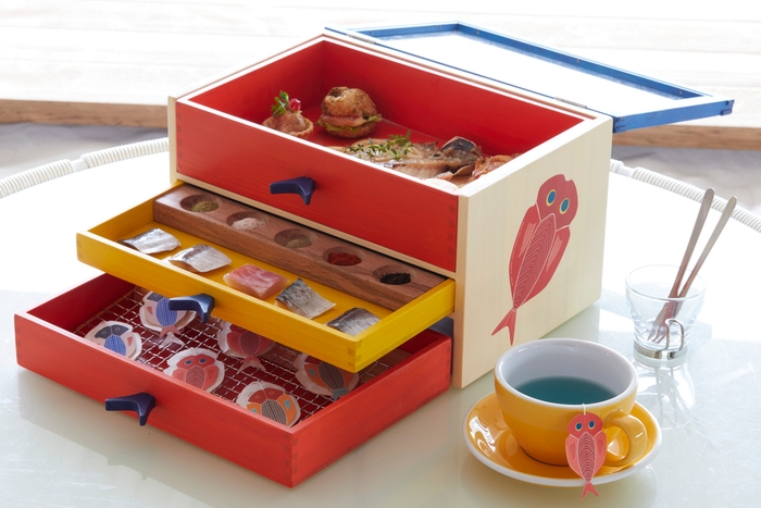 干物を活かしたアペタイザーや一口サイズの干物と、オリジナルの紅茶などとのペアリングを楽しめるBOXです。干物柄でキュートなBOXの引き出しの上段には、アペタイザーが並んでいます。金目鯛の干物入りのポンデケージョで作った「金目鯛バーガー」や、サバの干物を使った「サバキッシュ」など、干物を活かしてアレンジした4種類の料理です。中段には、一口サイズの干物と調味料が5種類ずつ入っています。自分好みに味付けができる食べ比べはもちろん、まるでパレットのように並んでいる調味料のカラフルな見た目にもワクワクします。さらに、下段に入っているのは、干物をモチーフにデザインされた3種類のティーバッグです。干物と相性ぴったりのオリジナルブレンド「ブルーオーシャンハーブティー」をはじめ、当ホテルでしかできないペアリングを楽しむことができます。このBOXを通して、干物をとことん堪能することで、干物の魅力を再発見できます。
