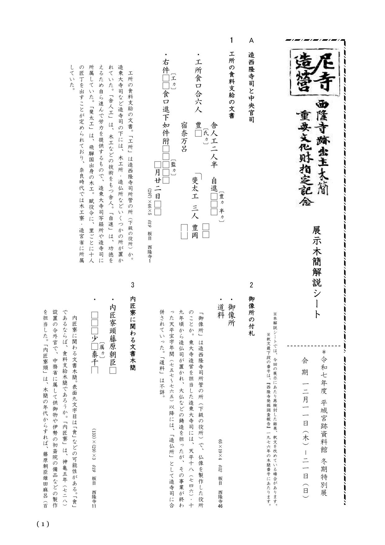 令和7年度平城宮跡資料館冬期特別展「尼寺造営-西隆寺跡出土木簡重要文化財指定記念-」展示木簡解説シートを公開しました
