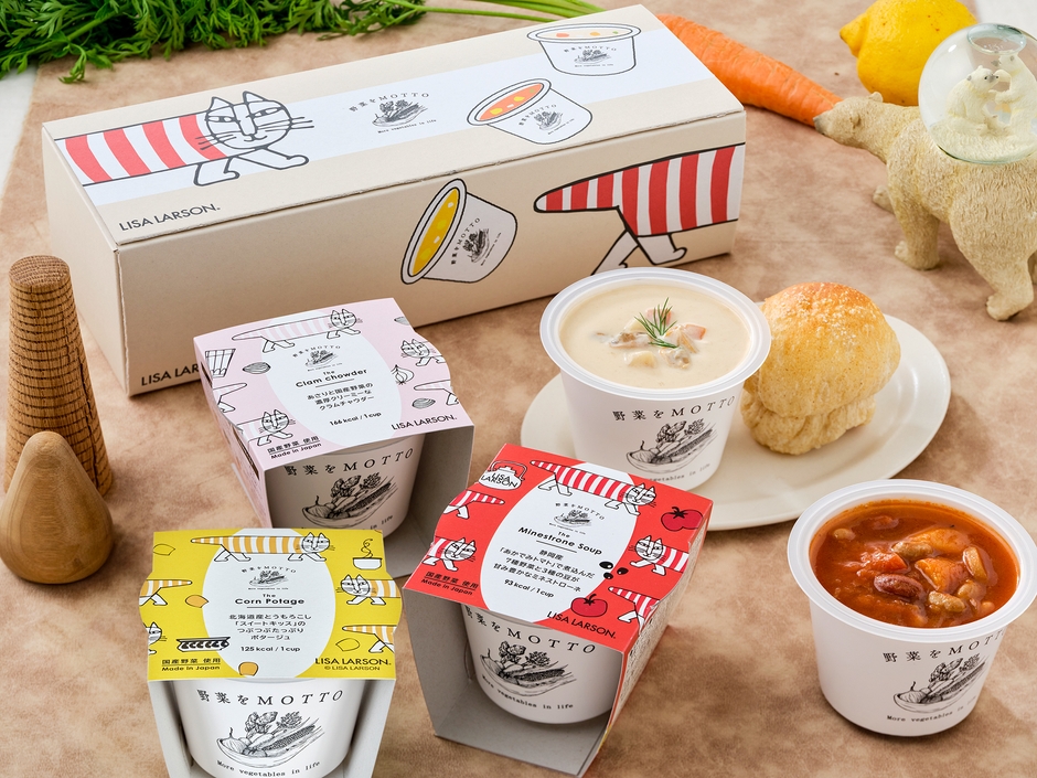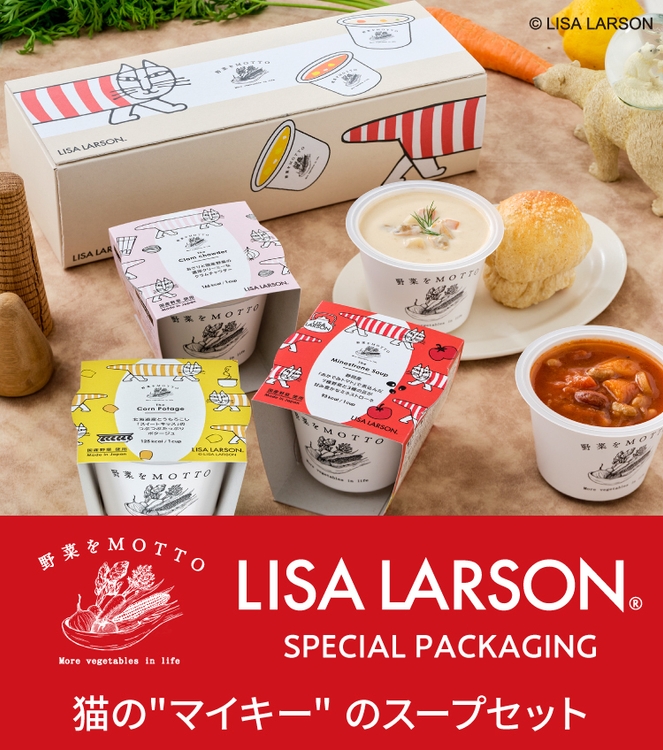 スウェーデンを代表する陶芸家・デザイナーであるリサ・ラーソンが生み出した日本で一番有名な北欧の猫「マイキー」が野菜をMOTTOにやってきました。3種類のスープパッケージにはそれぞれのスープに合わせたカラーのマイキーとリサ・ラーソンの娘のヨハンナ・ラーソンが描いた野菜のイラストが楽しく並び、ギフトボックスには大きなマイキーがおいしいスープをまるで食べたそうに見つめています。実はマイキーは日本で出版した初の絵本「BABY NUMBER BOOK」から生まれた日本とも馴染みのある存在です。