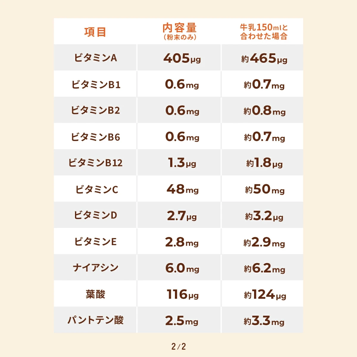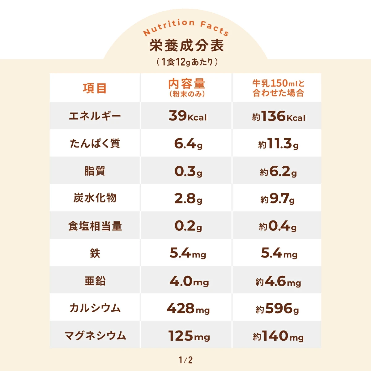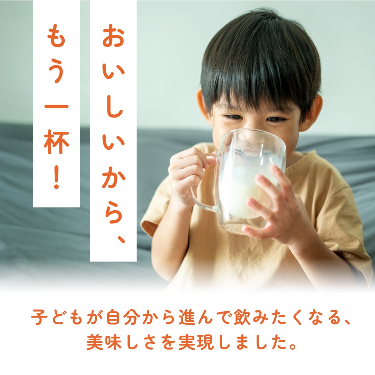 さらに、成長に必要なカルシウム、鉄、ビタミンDなど15種類の黄金栄養素をバランス良く配合。天然甘味料使用で、安心してお子様に与えられる設計です。