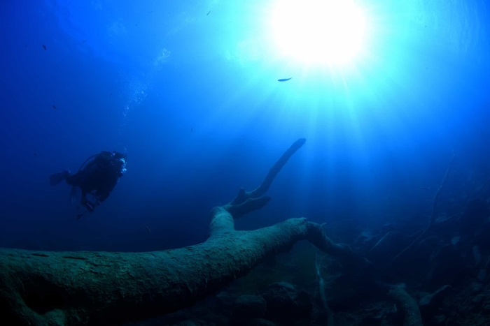 本栖湖は、日本有数の淡水ダイビングの名所です。動力船の乗り入れが規制されており、湖に流れ込む川がなく、湧水の湖で透明度が高いのが特徴です。見どころは、貞観(じょうがん)大噴火の時に、富士山溶岩が流れ込んだ溶岩地帯。溶岩のくぼみには、スジエビやギギが生息しています。また、湖底に静かに横たわる10m以上の大木や冷水が湧き出る大小の穴が点在するポイントなど、海にはない神秘的な景色を楽しめます。