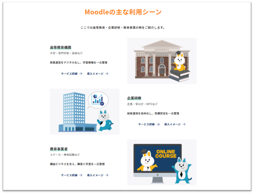 25年以上にわたるMoodle導入・運用実績をもとに、導入支援から教育設計、運用サポートまでの一貫した支援体制を分かりやすく整理しました。
