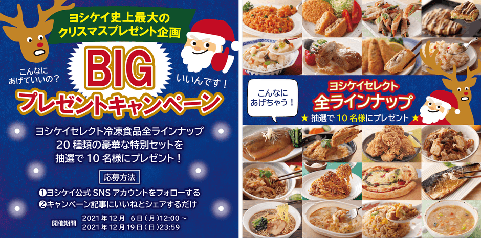 ヨシケイグループの本部、ヨシケイ開発株式会社(所在地:静岡県静岡市、代表取締役:井野口 雄一)は日頃のご愛顧に感謝して、ヨシケイ公式InstagramまたはTwitterで応募できる「こんなにあげていいの?いいんです!!ヨシケイ史上最大のクリスマスプレゼントキャンペーン」を2021年12月6日(月)より開催いたします。