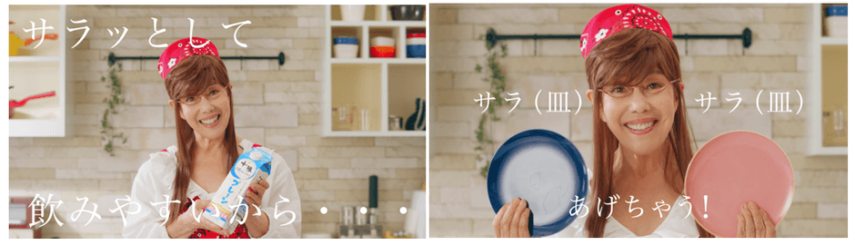 動画では、料理愛好家・平野レミさんが「十勝のむヨーグルト」を一口飲むと、突然「サラサラロングヘアー」に変身。そして、『サラっとして飲みやすいから』という理由だけで、飲むヨーグルトなのに「皿と皿」をプレゼントする謎キャンペーンを告知。十勝のむヨーグルトの“サラッとした飲みやすさ”と、“サラサラ”(皿皿)をかけたダジャレとなっています。