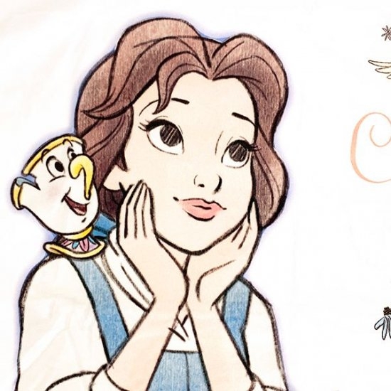 こちらは美女と野獣からベルデザイン。頬杖をついて上目づかいのベルが可愛いイラストになっています♪周りに咲くお花や楽しそうに飛び回る小鳥もキュート♡肩にはチップも乗っています。