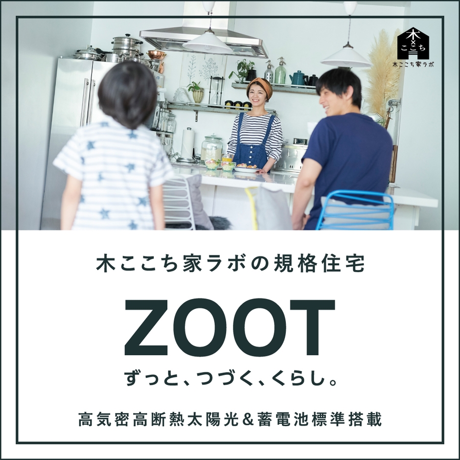 『ZOOT』は、これからの家づくりを考えた、人と地球にやさしいサスティナブル住宅です。これまで数々の注文住宅を手がけてきた「木ここち家ラボ」の設計による多彩なプランから、あなたの暮らしに合わせて、家づくりをすることができます。