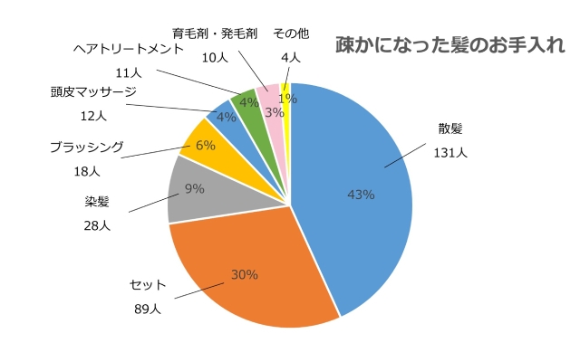 そのほか、「ブラッシング(5.9%)「ヘアトリートメント(3.6%)」「頭皮マッサージ(4.0%)」「育毛剤・発毛剤(3.3%)」など、髪のケアに関することも疎かになっているということも分かりました。また少数派ですが、中には洗髪自体を疎かにしているという方もいるようです。
