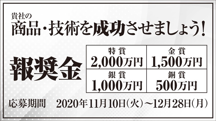 成功させたい!貴社の「商品・技術」をご応募ください。弊社の事業として採用させていただく場合、報奨金を授与いたします。 詳しくはWebサイトで。 日刊工業新聞 広告掲載*11/10