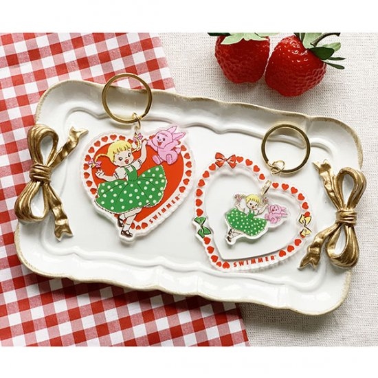 透明感のあるアクリルでできていて、まるでキャンディのようなかわいさです。女の子とうさぎのキャラクターを中心に、ハート型にデザインされています。