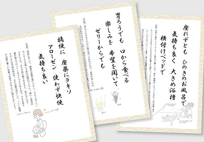 介護の方向性や理論を五・七・五・七・七の形にした句を100首つくり、句の説明とイラストを添えてカレンダーにして、エレベーターの中や休憩室などに貼ってみました。そうすると、「本は読まない」と言っていたスタッフはもちろん、面会に訪れた家族も興味深く見ています。
