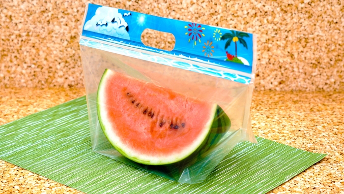 袋詰めが難しい“カットスイカ”専用 手提げタイプの包装『スイカチャック付スタンド袋』 累計販売枚数500万枚突破