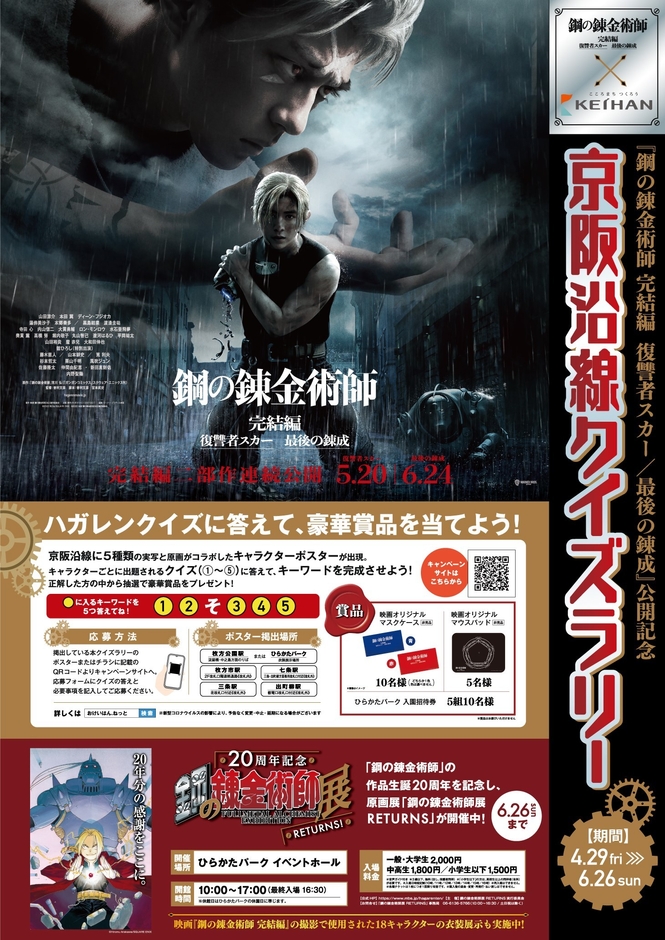 京阪ホールディングス株式会社(本社:大阪市中央区、社長:石丸 昌宏)は、5月20日(金)と6月24日(金)に完結編二部作連続公開となる映画『鋼の錬金術師 完結編 復讐者スカー/最後の錬成』とタイアップした「京阪沿線クイズラリー」を4月29日(金・祝)から開催します。