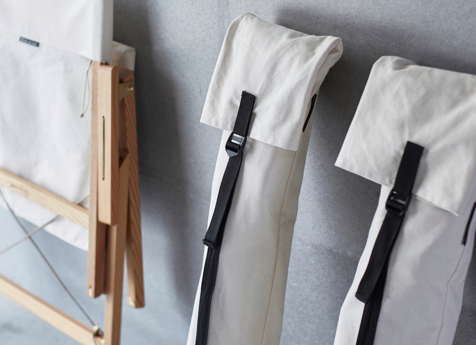 フレームは岐阜県で山に道を作るために切り倒された支障木を。シートには愛知県知多半島で織られるMILスペックの高密度帆布の生地を。シートの縫製やオプションの手縫いの革製品は、名古屋市の障がい者就労支援施設の協力を得て、一脚ずつ丁寧に作り上げています。地域活性、多様性とSDGsを意識した製品づくりにもこだわりました。