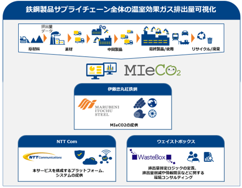 伊藤忠丸紅鉄鋼、NTT Com・ウェイストボックスと連携し サプライチェーン全体の温室効果ガス排出量を算定・可視化・分析する クラウドサービス「MIeCO2(ミエコ)」の提供を開始