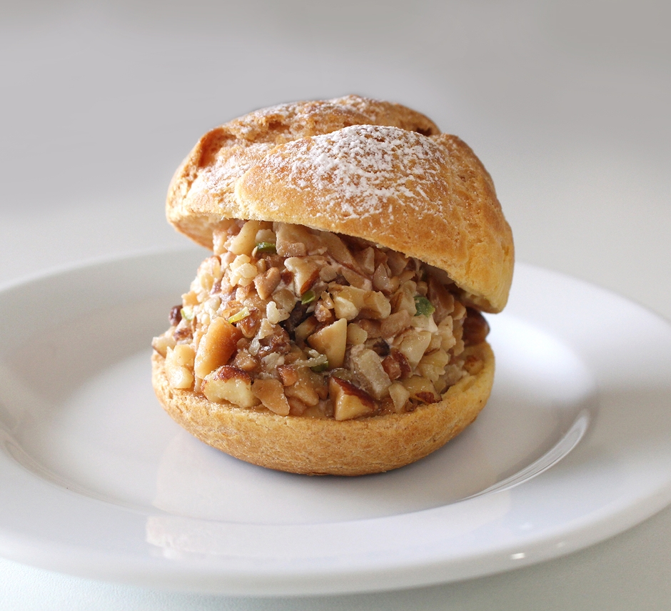 クルミのキャラメリゼとクッキーを別々に作りあげ、口どけの良いチョコレートを間にサンドすることで食感のハーモニーが生まれます。
