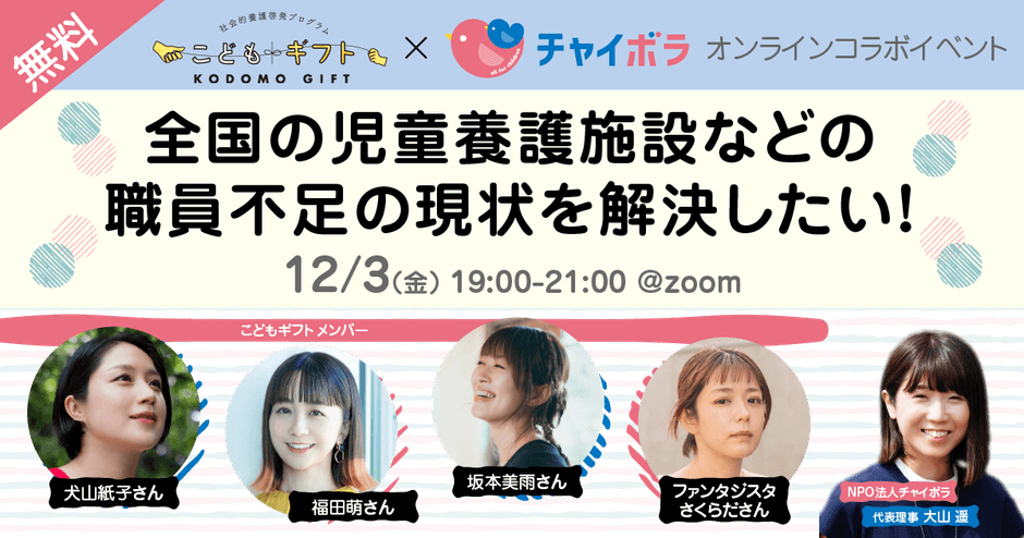 特定非営利活動法人チャイボラ(所在:東京都豊島区、代表理事:大山 遥、以下「チャイボラ」)は、児童養護施設をはじめとする社会的養護の実態や課題について一般のかたにも正しく理解していただくための無料オンラインイベントを11月・12月の2か月間で、複数回開催いたします。イベントはテーマに合わせて、ゲストにも参加いただく予定です。11月26日(金)は、認定NPO法人児童虐待防止全国ネットワーク理事高祖 常子さん・12月3日(金)は犬山 紙子さんや福田 萌さんをはじめとするこどもギフトメンバーの皆さんと一緒に、社会的養護の現場が抱える課題に対して、一人ひとりができることは何かを一緒に考えます。