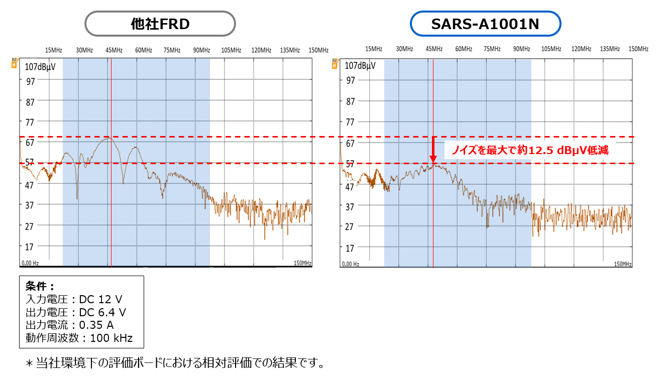 SARS-A1001Nは、逆方向回復時間trrが比較的長く設定されており、ターンオフ時に発生するリンギング電圧を低減できます。これにより、スイッチングノイズを抑制します。