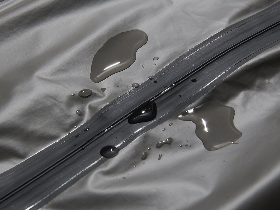 当社から新規ファスナーの要望を出し、約4年にわたるYKKの開発に協力して完成した新構造の止水ファスナーです。フィッシングシーンでは雨に限らず風圧を伴った水しぶき等、様々な影響によりウェア内に水が染み込むことがあり、従来ではフロントファスナー裏に重なるように生地(持ちだし)を付帯することで防水性を高めてきました。この『AquaGuard(R) Tightened』を採用することで、持ちだし生地がなくてもウェア内への水の浸入を防ぎます*1。