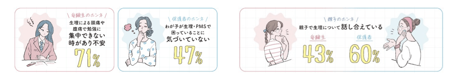 その結果、女子学生の71%が「生理による頭痛や腹痛が原因で勉強に集中できない不安を抱えている」と回答する一方、母親の47%が「娘が生理で困っていることに気づいていない」ことが分かりました。