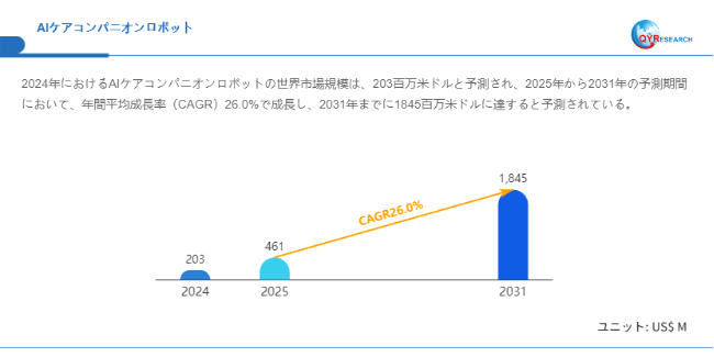 QYResearchが発表した新たな市場調査レポート「AIケアコンパニオンロボット―グローバル市場シェアとランキング、全体の売上と需要予測、2026~2032」によると、世界のAIケアコンパニオンロボット市場規模は2024年の約203百万米ドルから2025年の461百万米ドルへと順調に拡大すると見込まれ、予測期間中は年平均成長率(CAGR)26.0%で成長し、2031年には1845百万米ドルに達すると予測されている。