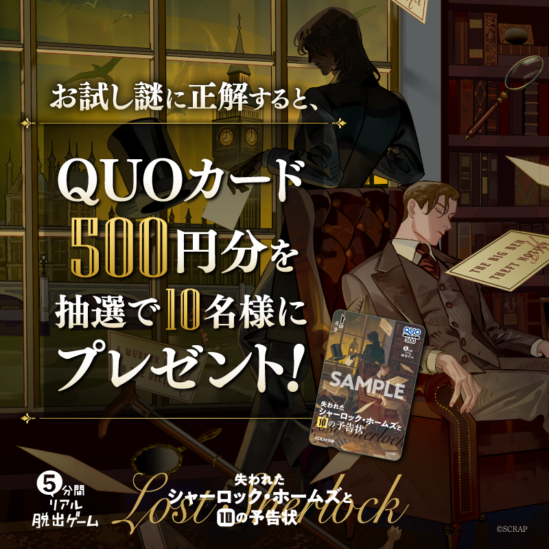 また、お試し謎に正解し結果をSNSでシェアすると表紙デザインのQUOカードが当たる「お試し謎キャンペーン」や、皆さんからの犯行予告風の謎を募集する「予告状謎コンテスト」を開催いたします。どちらも詳細は特設サイトもしくはSCRAPマガジンおしらせページよりご確認ください。
