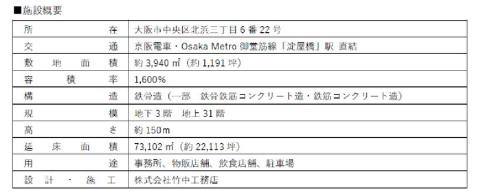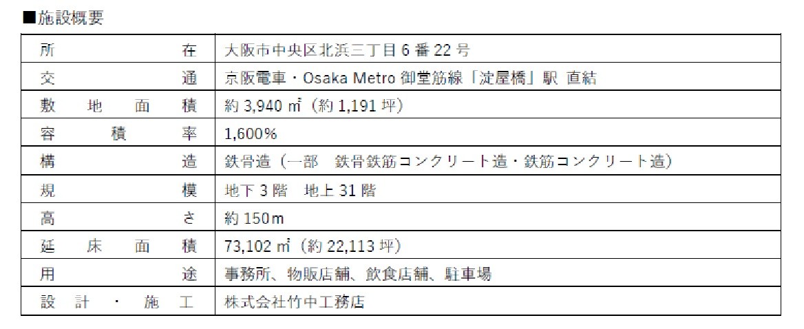 本事業は、中央日本土地建物株式会社が所有する「日土地淀屋橋ビル」と京阪ホールディングス株式会社が所有する「京阪御堂筋ビル」を共同で建て替え、エリア最高となる高さ約 150mのランドマークビルを開発したものです。オープンイノベーション施設を備えたオフィスゾーンや、商業ゾーン、婚礼等多目的に使えるイベントスペースなどからなる複合施設で、2024年8月5日に本事業の施設名称を「淀屋橋ステーションワン」に決定し、2025年6月23日に開業しました 。