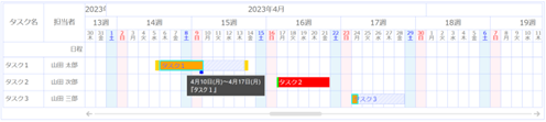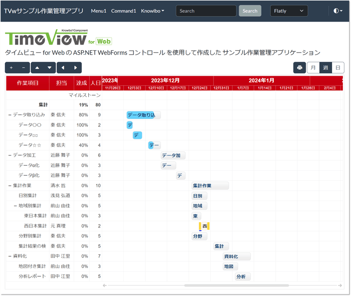 また、達成率(進捗率)や吹き出し、マイルストーンの表示、クリックイベントの提供、時間の表示単位の変更、印刷機能など、スケジュール管理アプリケーションを作成するための豊富な表現力を持っています。