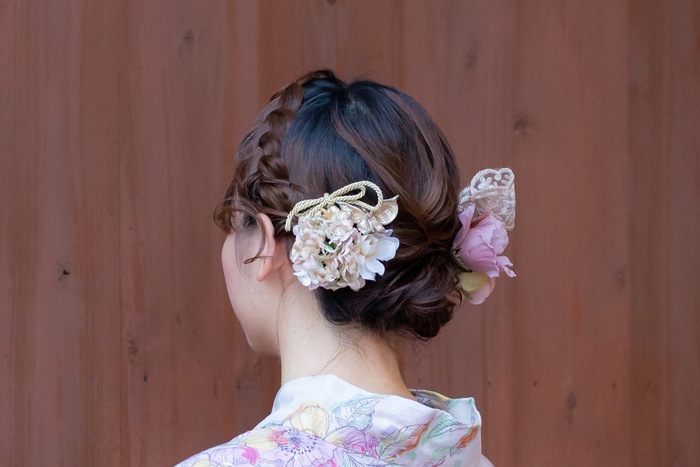 他にも、当日+1650円で飾り紐、レース帯締めやレース襟などを含めた「小物つけ放題オプション」も承っています。