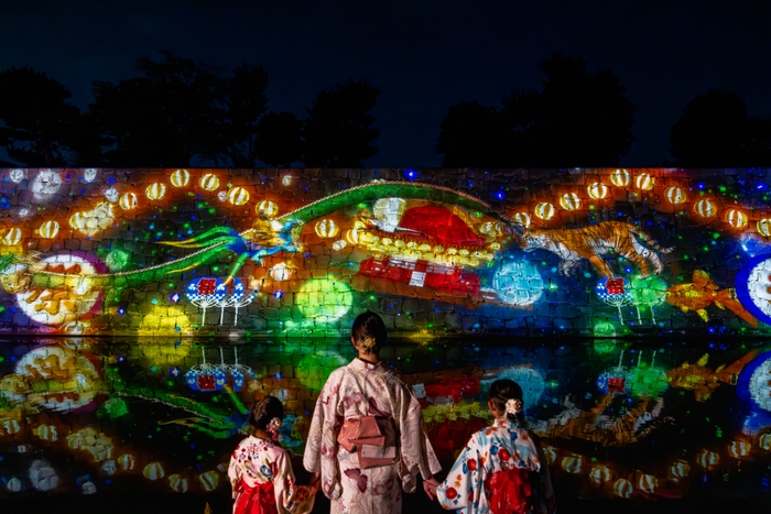 夜の美しい二条城を、プロジェクションマッピング花火や、涼やかな風鈴の音色が広がる天の川ライトアップ、縁日屋台のデジタルアートが彩ります。