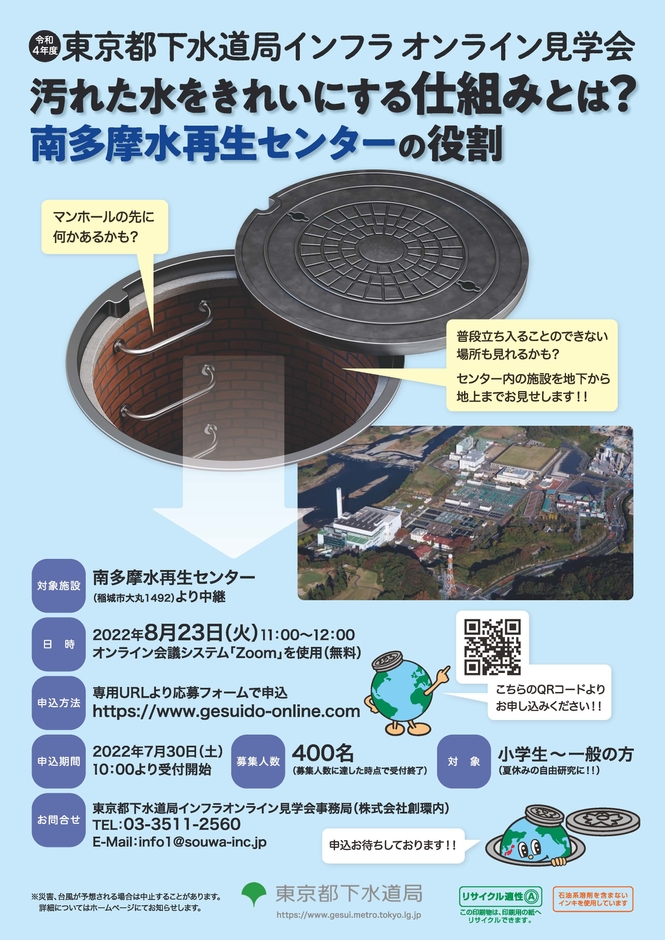 御質問は、「東京都下水道局インフラオンライン見学会事務局(株式会社創環)」(電話:03-3511-2560、メール: info1@souwa-inc.jp )までお問合せください。