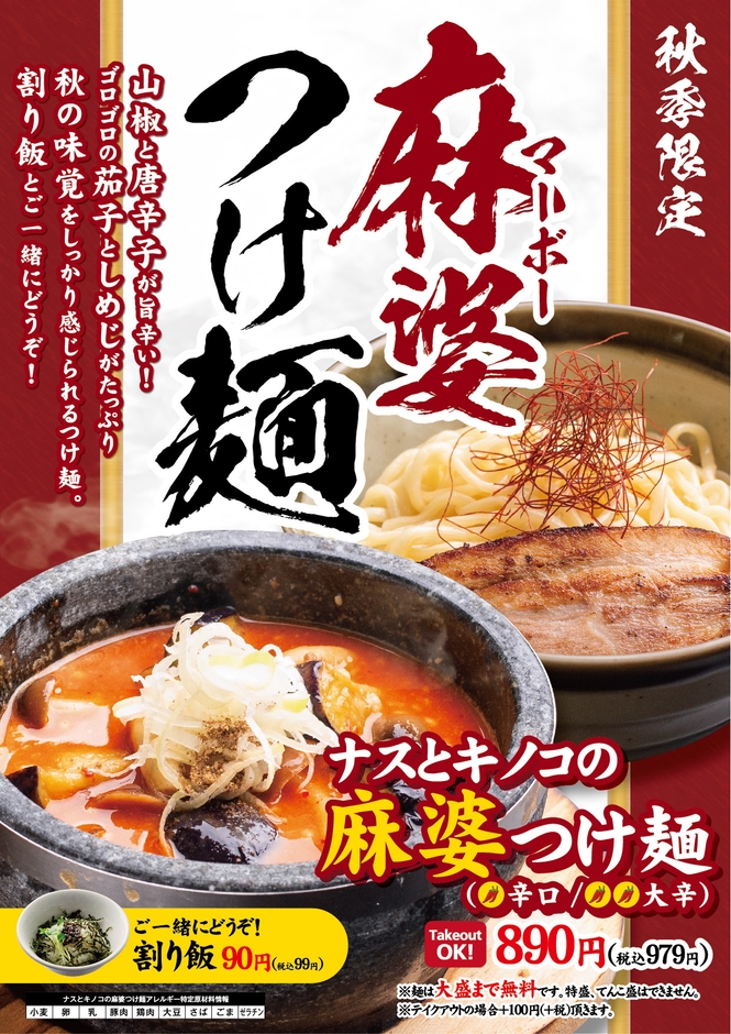 風雲丸 秋季限定メニュー「ナスとキノコの麻婆つけ麺」を販売中!
