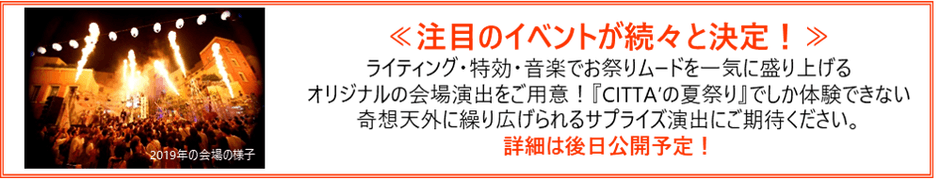 今年の夏は4年振りにパワーアップして帰ってきた『CITTA'の夏祭り』に、ぜひご来場ください。