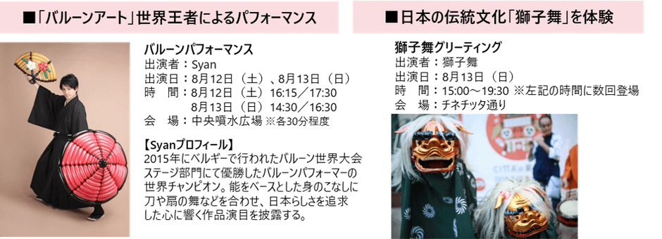 この度の4年振りの本格開催では、前回の2019年に大好評を博したアジアのナイトマーケットをイメージしたチッタオリジナルの「夜市」を再び実施し、ポップなネオンサイン装飾と共に夏の夜を盛り上げます。約70店の屋台がずらりと軒を連ね、バラエティー豊かな世界各国の人気メニュー約100種類が集結するグルメスポットの他、日本の伝統的な「縁日」の定番メニューや遊戯などもお楽しみいただけます。また、バルーンアート世界チャンピオンによる「和」をテーマにしたパフォーマンスや、地元川崎の歴史ある音楽学校「洗足学園音楽大学」から生まれたアイドルグループ「MARUKADO」によるフリーライブや浴衣による打ち水など、連動企画も続々と決定いたしました。