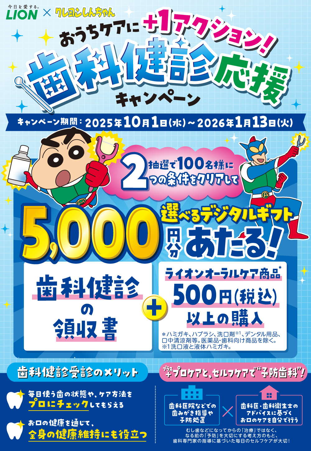 対象店舗(イオングループ、ウエルシアグループ、スギ薬局グループ、ツルハグループ)で対象商品500円(税込)以上お買い上げのレシートと歯科健診の領収書を1口として、WEBでご応募いただくと、抽選で合計100名様に5,000円分の選べるデジタルギフトが当たります。
