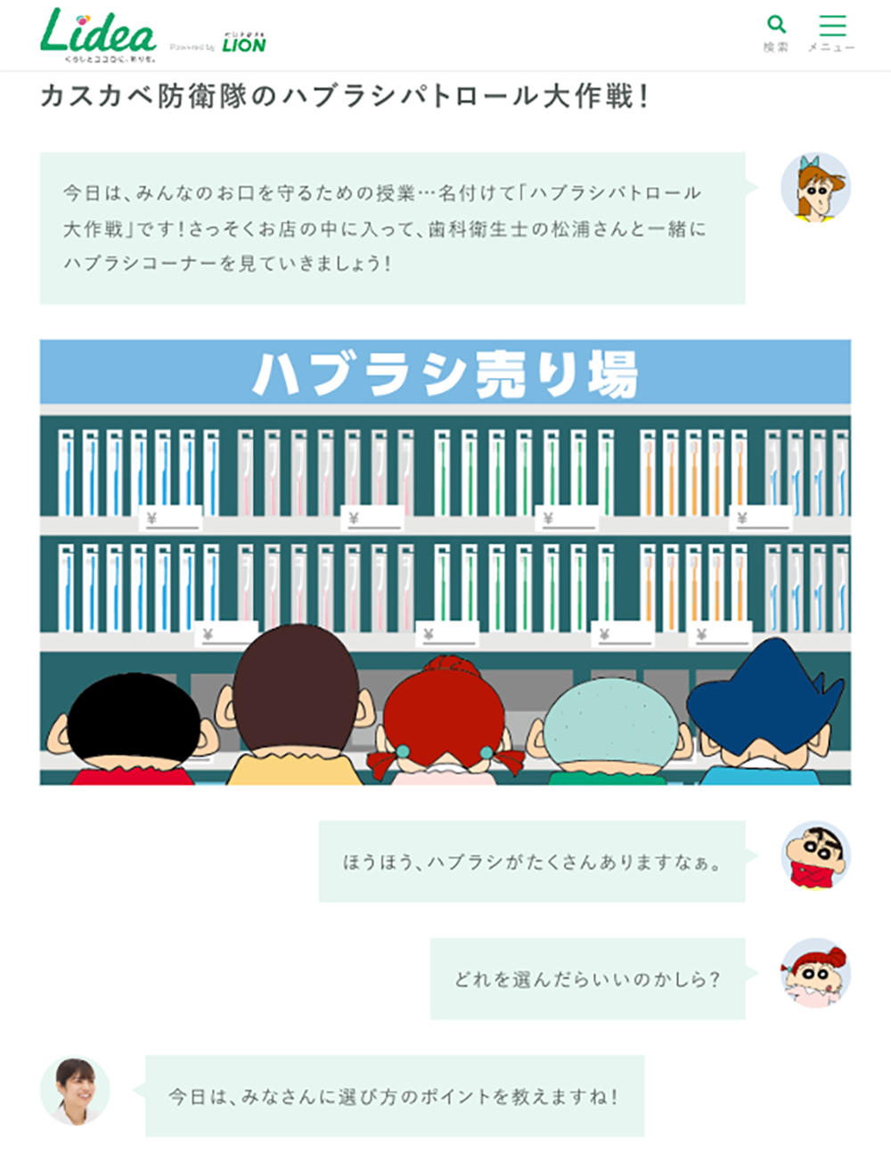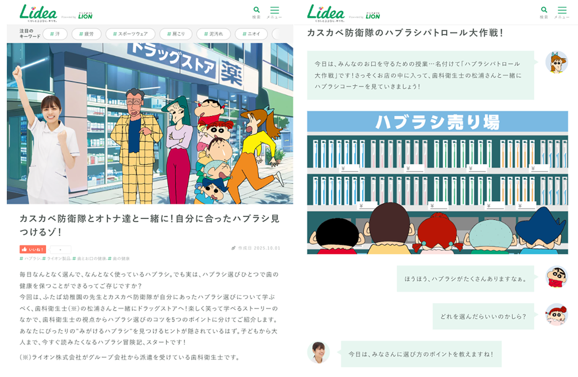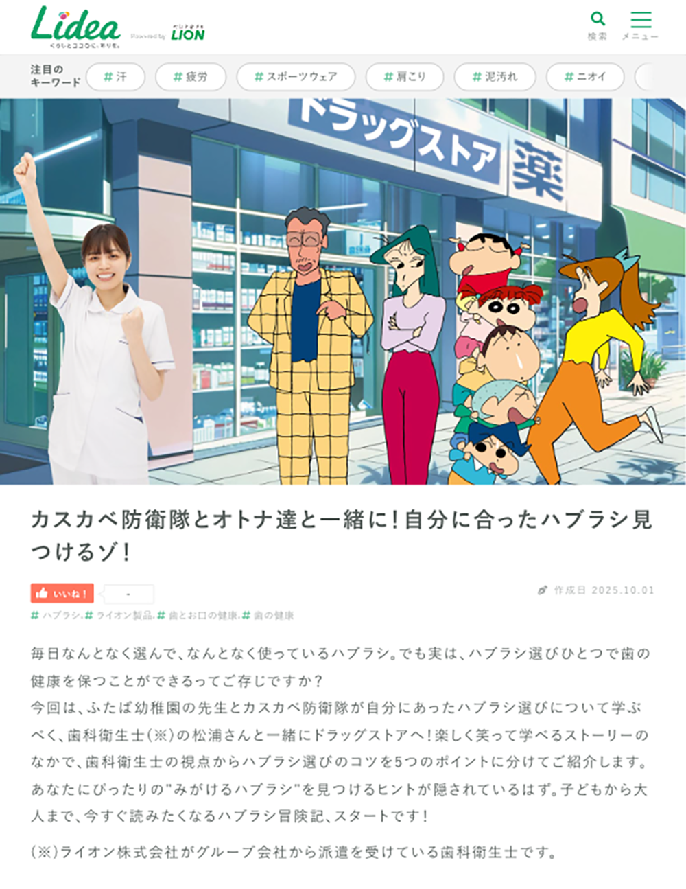 ライオン公式サイト内のWebメディア「Lidea(リディア)」にて、ライオンがカスカベ防衛隊とふたば幼稚園の先生、歯科衛生士によるハブラシ選びを学ぶ対談コンテンツを公開します。子どもたちはドラッグストアでハブラシ選びのポイントを楽しく学び、歯科衛生士が「目的ごと」「お口の形」「みがき心地」「映えるハブラシ」「使い分ける」の5つのポイントを紹介します。子どもから大人まで楽しめる内容で、毎月8日を「歯ブラシ交換デー」とする習慣も提案しています。