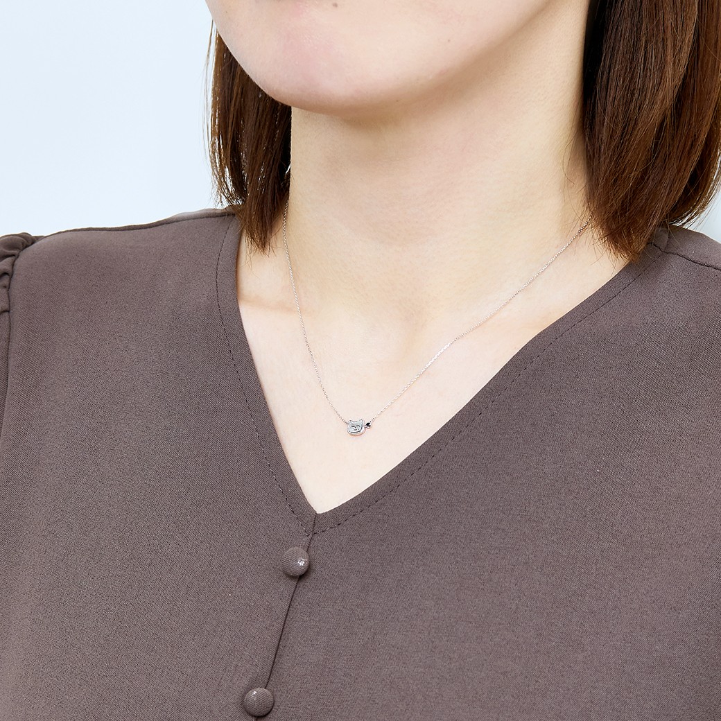 たくらみ顔をした「わるめのねこ」とワンポイントのストーンが、胸元で愛らしくきらめくデザイン。